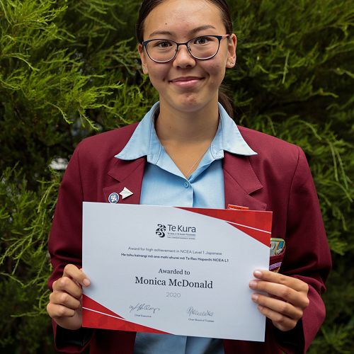 Visit this articleMonica McDonald was given a Te Kura award for high achievement in NCEA Level 1 Japanese.