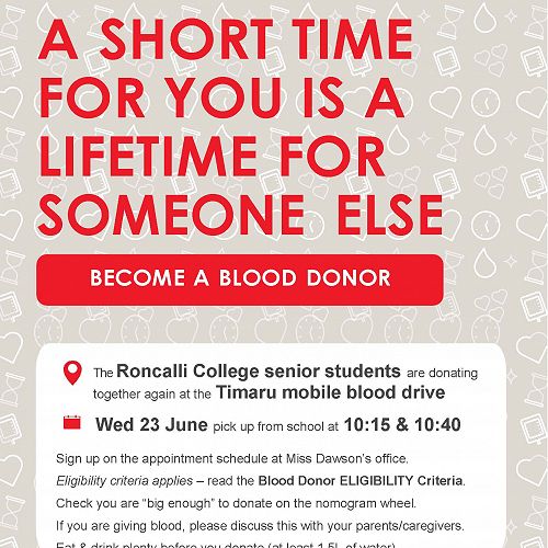 Visit this articleNew Zealand Blood Service (NZBS) will be bringing two groups of Roncalli College senior students in to donate together at the Timaru mobile blood drive: