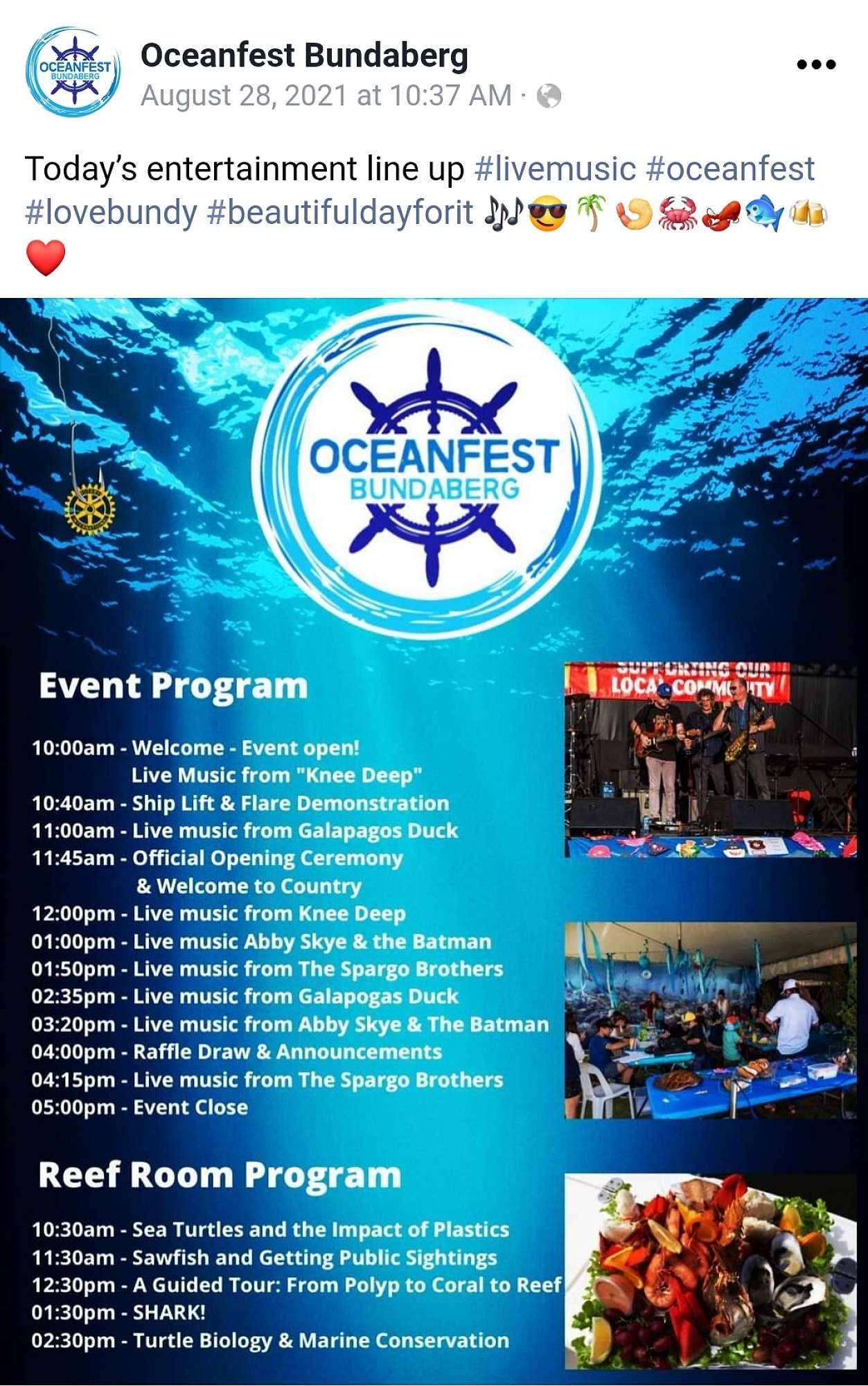 When members of the Rotary Club of Bundaberg Sunrise decided to reinvent their signature, annual community event, they wanted to focus on a theme of great seafood, local marine and industry and the region's amazing environment – thus Oceanfest was born. This is a very engaging Festival that focuses on the importance of clean water environments.