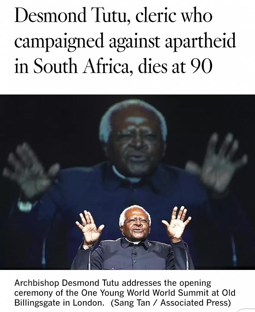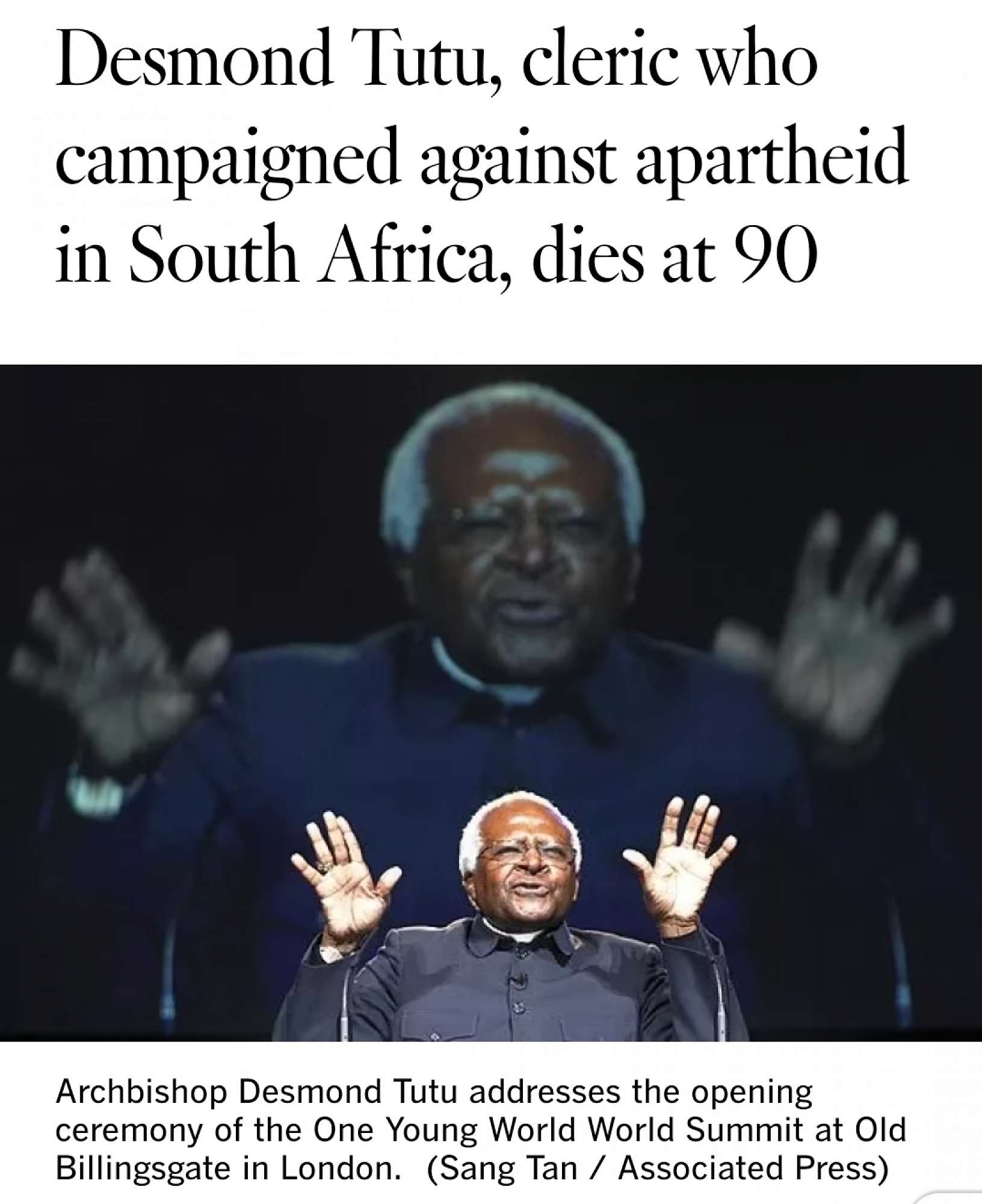 Archbishop Emeritus Desmond Tutu, giant in fight against apartheid South Africa, dies at 90.