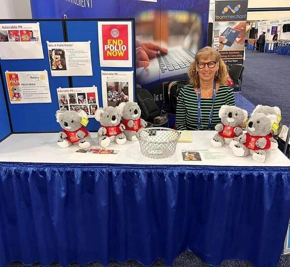 A consignment of Polio Koalas was sent to the Rotary Convention in Houston and they sold out in two and a half hours. Thanks to Colleen Rose Jones who set up booth number 425 in the House of Friendship and handled all the sales. PK was photographed everywhere around the Houston Convention Centre and was even photographed with the big koala that is the mascot for the RI Convention in Melbourne in 2023.