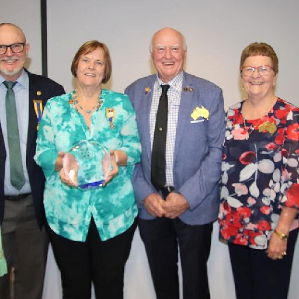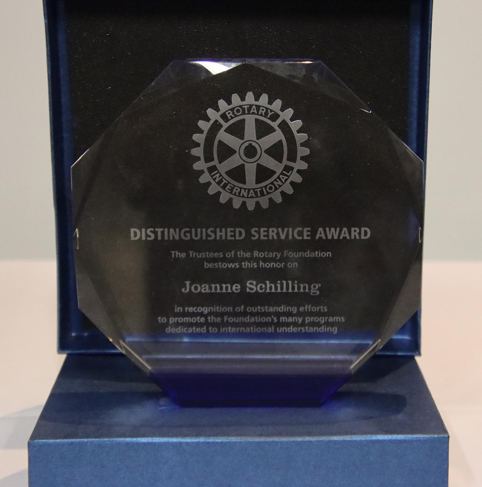 Past District Governor Joanne Schilling has been honoured by the Board of Trustees of the Rotary Foundation with the Distinguished Service Award for her exemplary service to Rotary's goals and her commitment to global good.