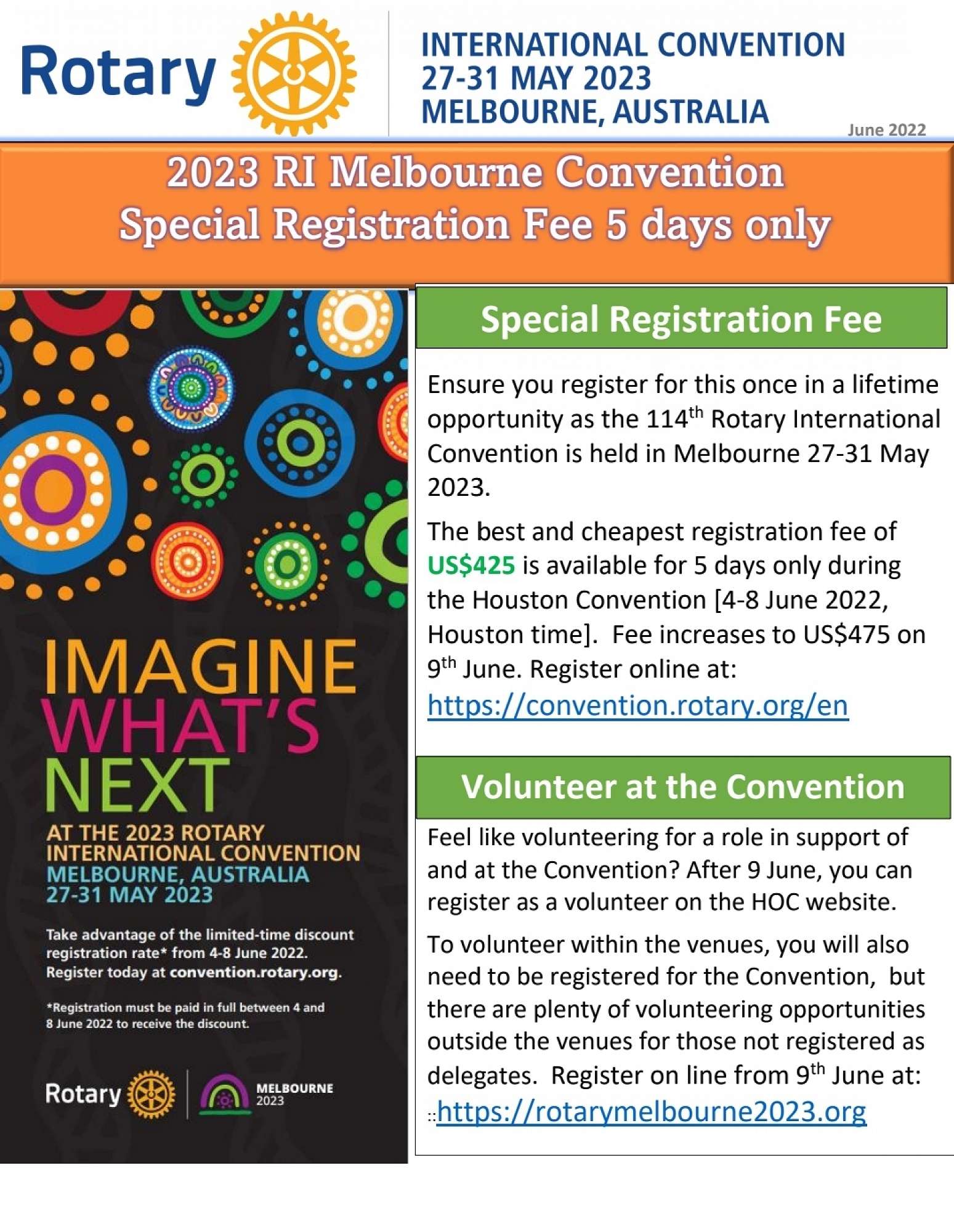 Use the link to find out more and register: https://convention.rotary.org/en/melbourne?cid=soc_ic23_20220604_soc_fb_mem_pd_junpromo_na&fbclid=IwAR1aPuflDcSD0TJWI5-466qWt1qEpKPIZsSfKMhjKLfTW7qrHSIJ0RKrJVs