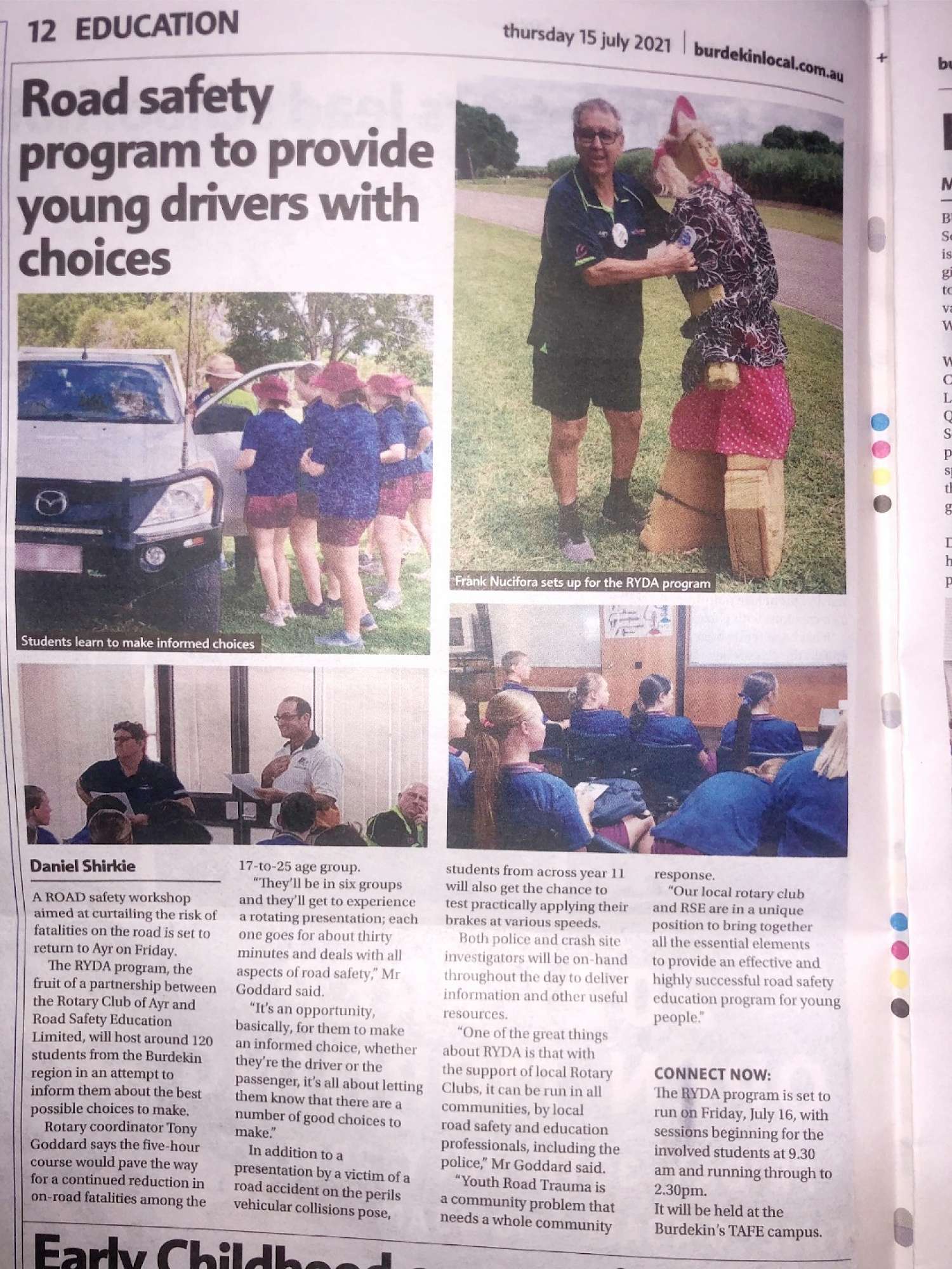 The ROTARY CLUB OF MT MORGAN sponsored all 36 Year 11 students to attend RYDA in July 2021. And the Rotary Club of SARINA donated $900 in October 2021 to Sarina State High to cover the bus and student payments of $10 per person for RYDA attendance because children are the future of small communities. The AYR Rotary Club also gained accolades for providing this service for Uear 10 students.