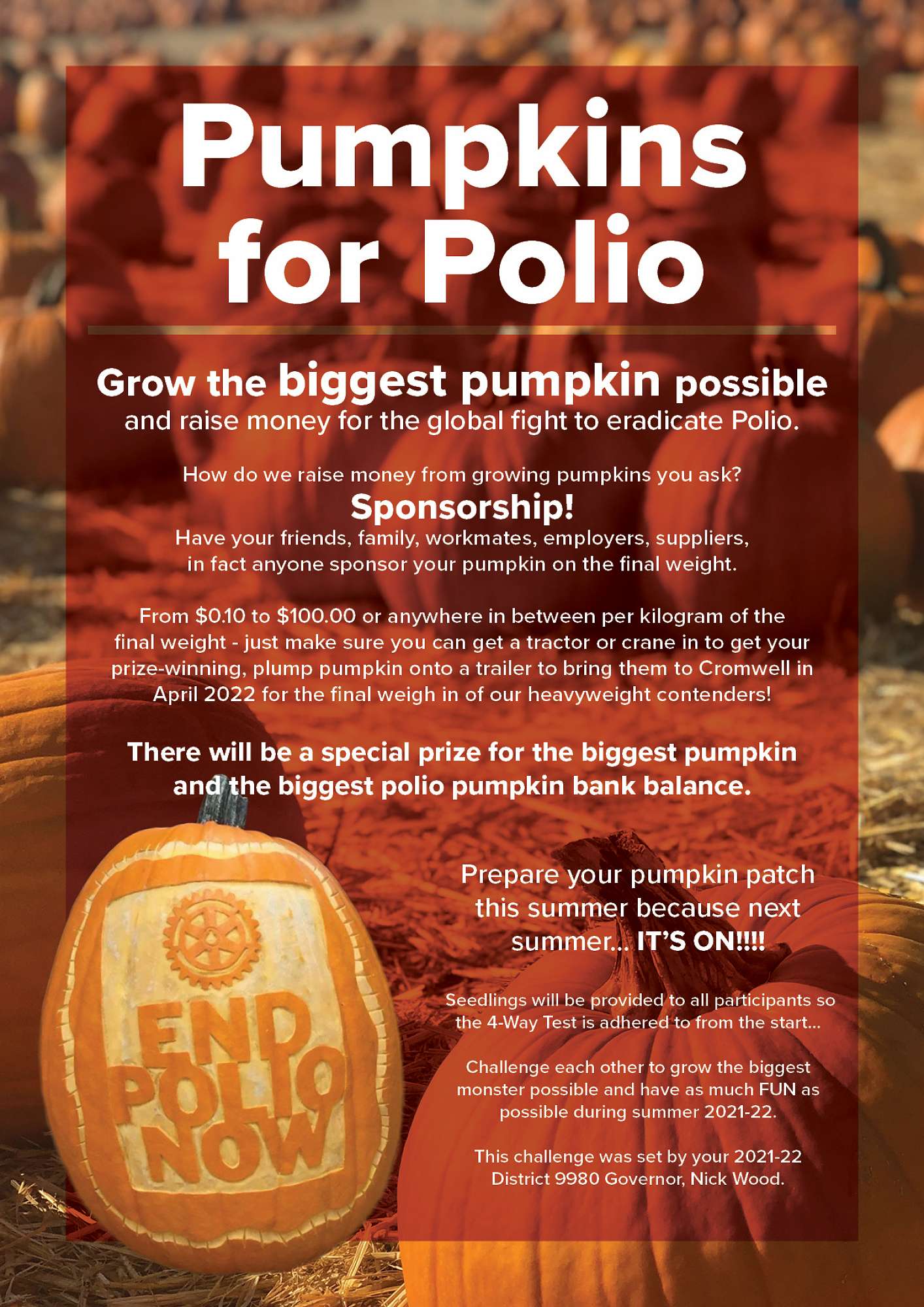 Governor Nick issued the challenge to his members to support the END POLIO NOW campaign by growing the largest pumpkin possible - with a year’s notice to prepare the pumpkin patch!