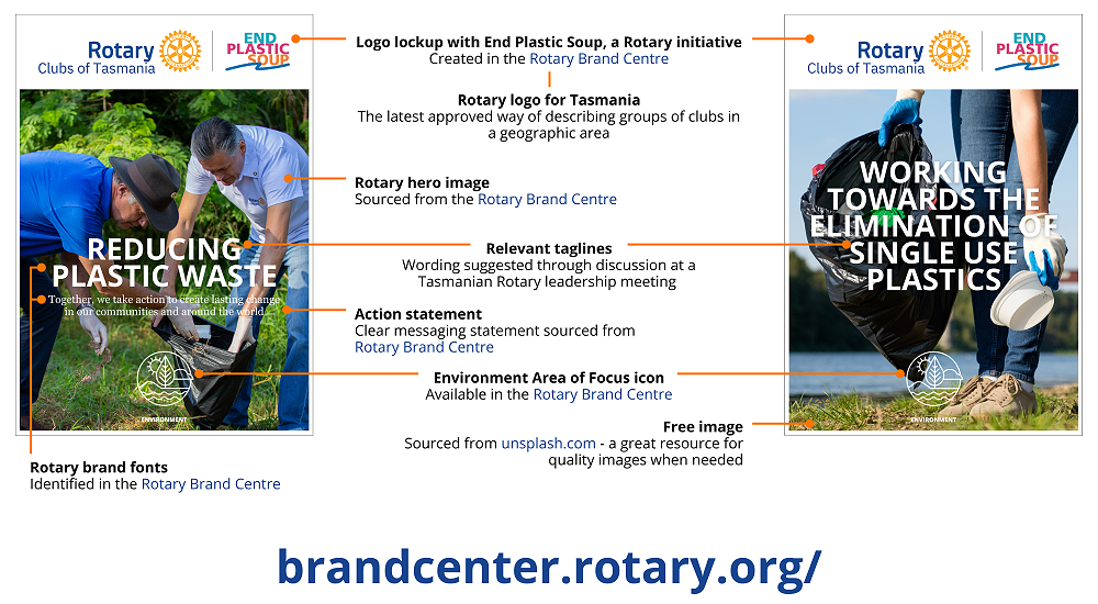 The elements Meg has used include: two photos found on the My Rotary Brand Center, wording suggested by discussion at the leadership meeting, approved Rotary fonts, approved Environment logo, the latest approved way of describing groups of clubs in a geographic area and a lockup with End Plastic Soup, a Rotary initiative.