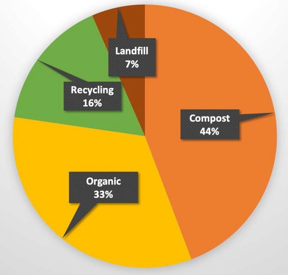 - Data Collection: Waste data showed 44% compostable food packaging, 33% organic food waste, 16% recycling, and only 7% general waste.