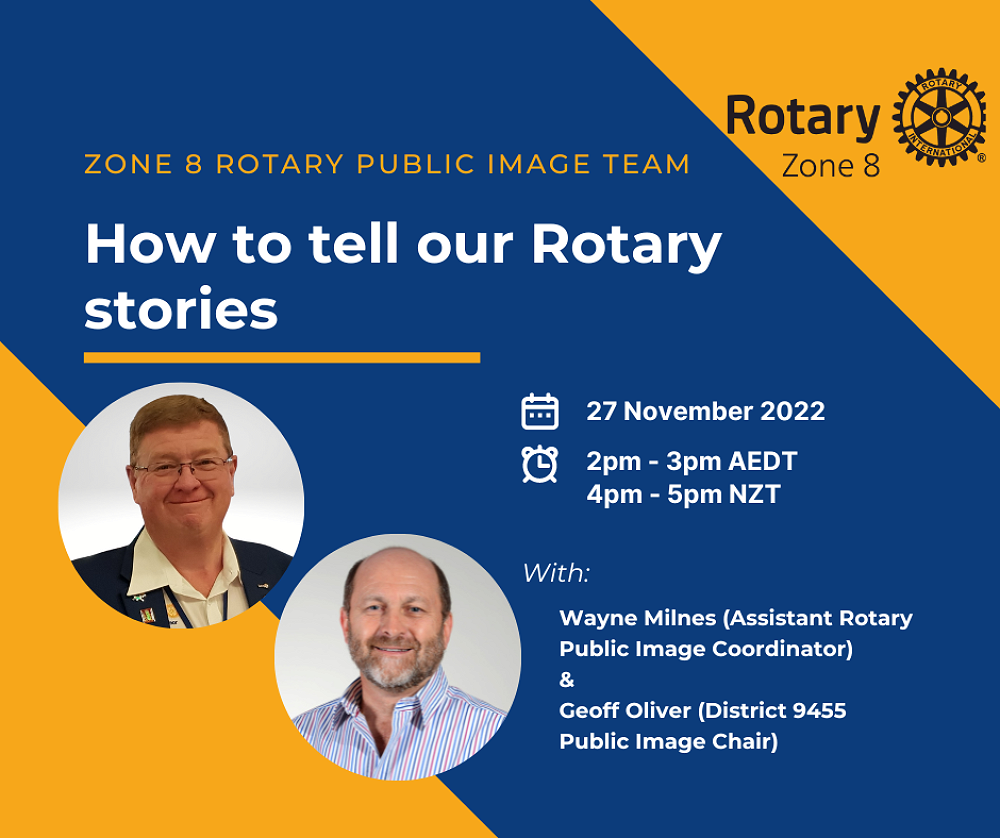 Join us for our last learning session for this year. Assistant Rotary Public Image Coordinator for Districts 9455, 9465 and 9510 PDG Wayne Milnes and Geoff Oliver, a new Rotarian and District 9455 Public Image Chair with over 50 years of experience in the Film & TV Industry and over 19 years in Training and the VET sector as they share their insights into how to tell our Rotary stories. Please note the time has changed from that previoulsy advertised.
