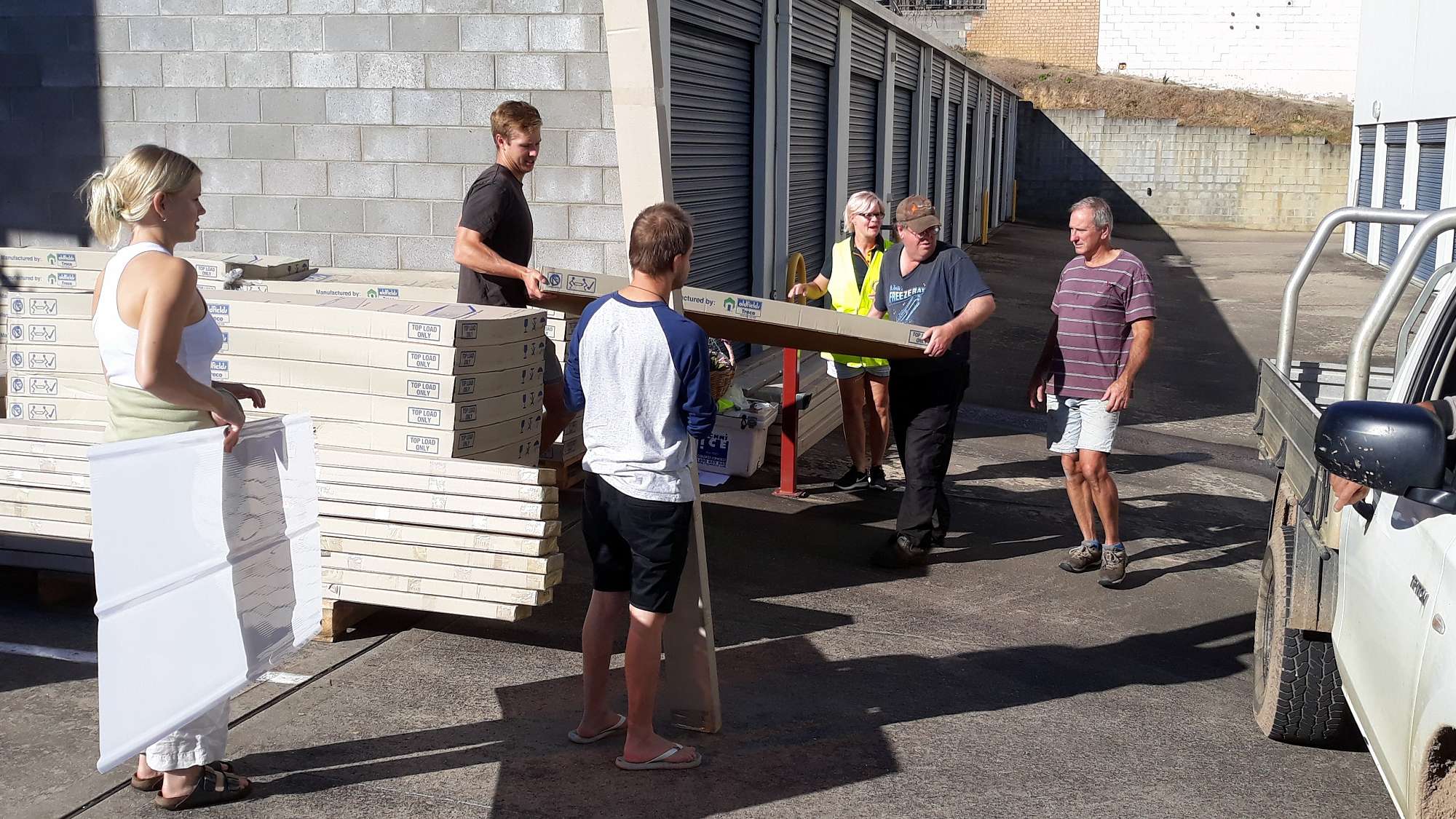 So, just prior to Easter seven tons of sheds on fourteen pallets arrived on a Tattam’s truck at Batemans Bay, Storage King. Easter Sunday morning was the first pickup, bright and early and smiles on faces, some Batemans Bay Rotary volunteers and wrangled family members spent the next four hours giving out 45 Garden sheds with an Easter egg to boot. Given the boxes containing the sheds weighted up to 85kg, several workers where needed to successfully sort and load each shed. Many very happy clients thanked Oldfields, Rotary and the Bushire Recovery Support team for their kindness.