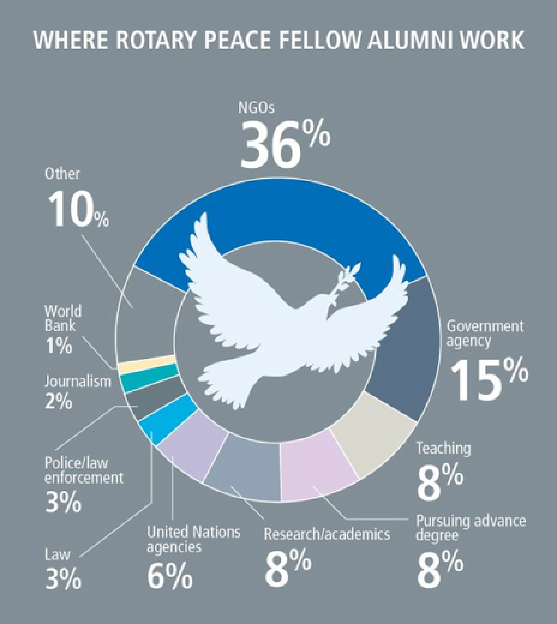 The initial class of Rotary Peace Fellows commenced their studies in 2002. To date there are over 1,600 graduates working in more than 115 countries. Up to 130 fellows are selected each year, selection is based on personal / academic and professional achievements. The selected fellows earn either a Masters or a Post Graduate Diploma in Peace & Development studies from one of the seven Rotary Peace Centres.