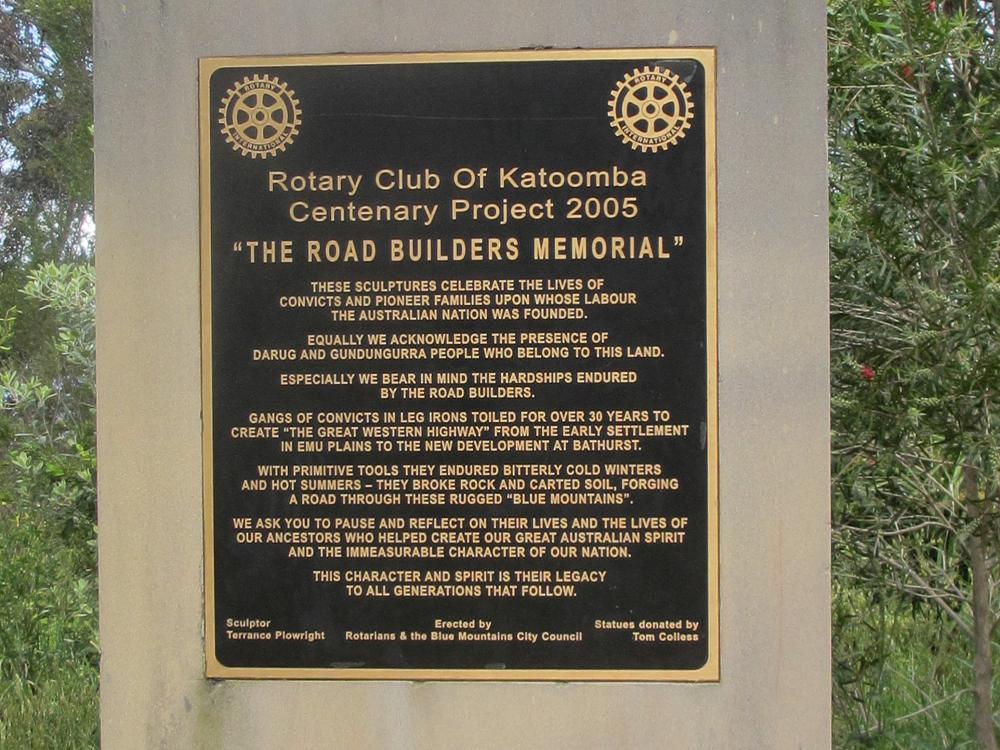 As a Centenary Project for 2005, Tom Colless a member of the Rotary Club of Katoomba, donated a five-sculpture group as a memorial to the Convict Road builders who first pushed a road across the Blue Mountains in 1814. The statues are one and a half times life size and are located in Lilianfels Park near Echo Point in Katoomba.