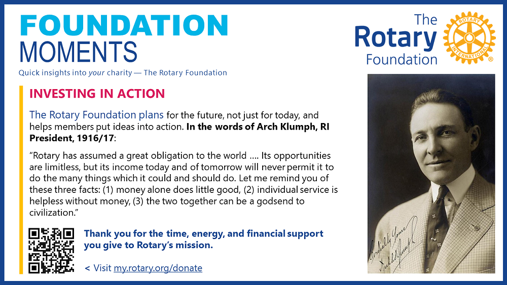 The Rotary Foundation plans for the future, not just for today, and helps members put ideas into action. In the words of Arch Klumph, RI President, 1916-17: