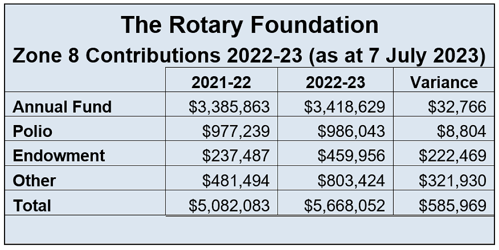 Big thanks go to all of our regular contributors; the Centurions and Paul Harris Society members in our Region; those who have joined the new PolioPlus Society; the loyal Clubs which contribute to the Foundation Annual and Polio Funds annually. Thanks must also go to those who chose to become Major Donors or made endowments to the Foundation during the past year.