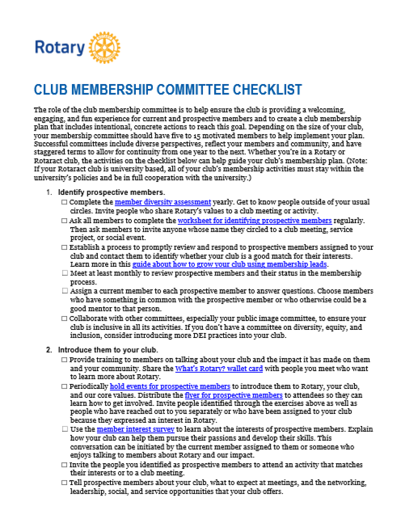 Successful committees include diverse perspectives, reflect your members and community, and have staggered terms to allow for continuity from one year to the next. Whether you’re in a Rotary or Rotaract club, the activities on the checklist can help guide your club’s membership plan.