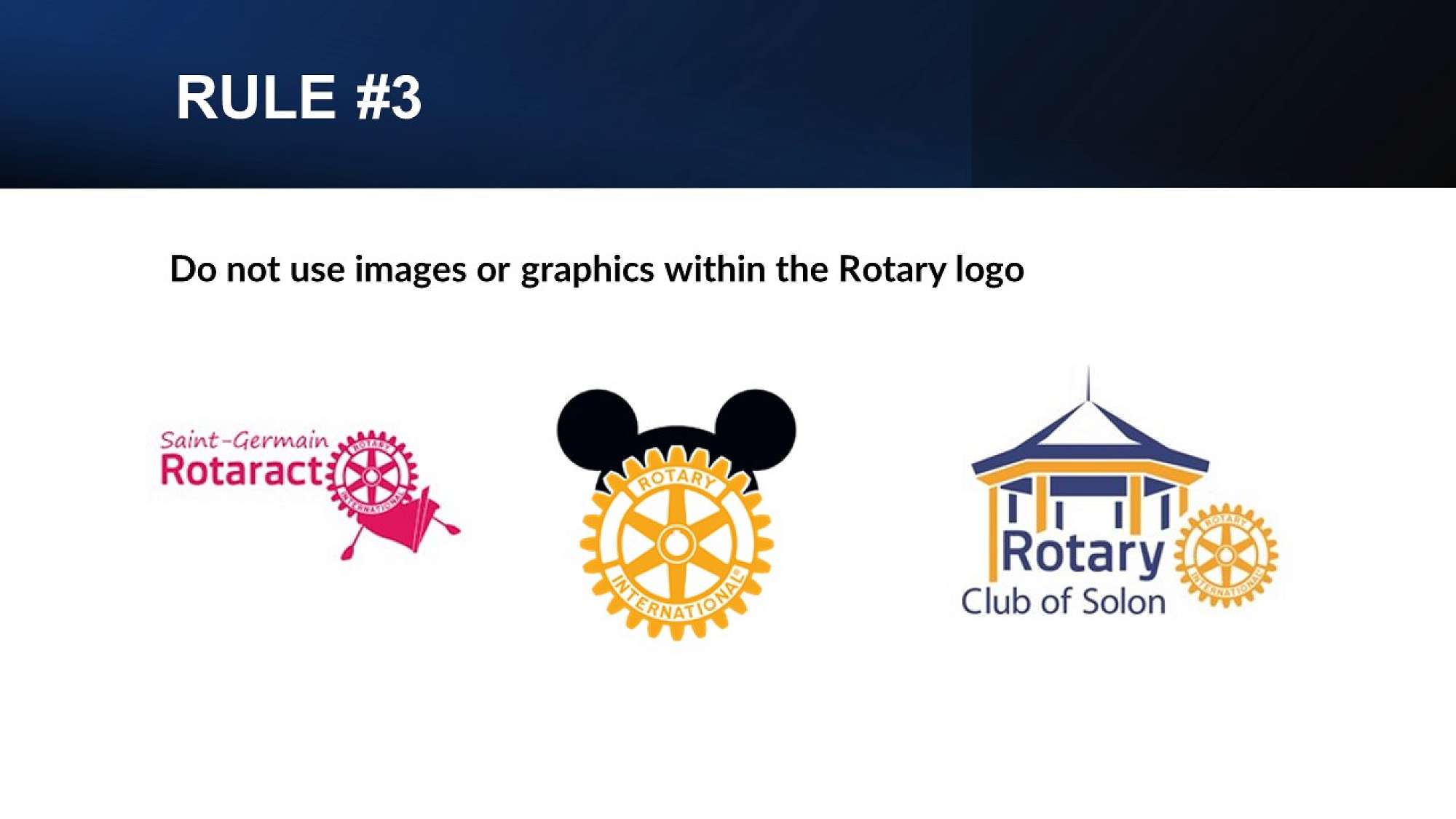 3. Do not use images or graphics within the Rotary logo. Nike would not add a tree behind their swoosh, nor should we add anything extra to the Rotary club logo.