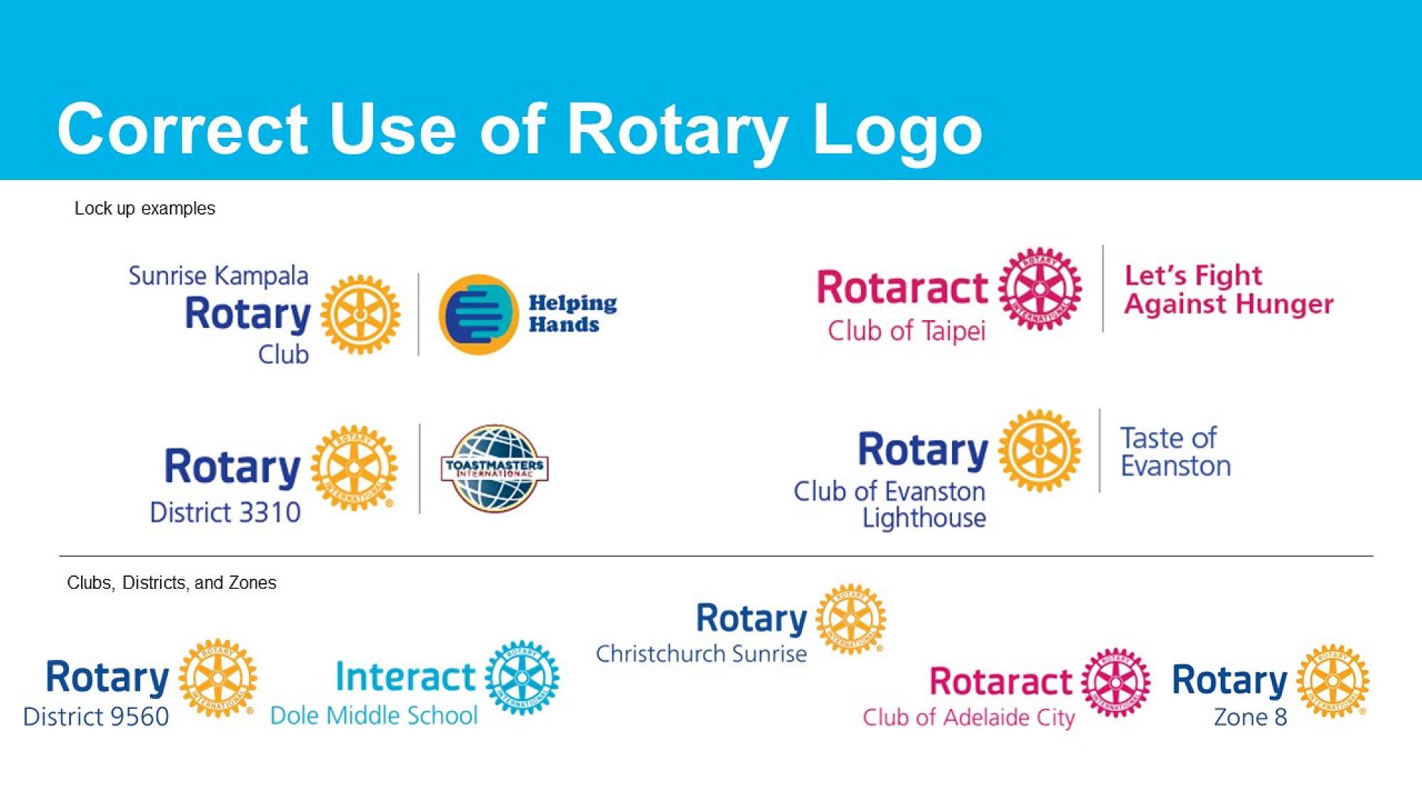 1. Always use the club or district identifier when using the Rotary logo. A club can use the name they are known by locally, adding their club’s name above or above and below the Masterbrand Signature. The layout you choose depends on how you say your club’s name. The position of the words and the wheel, and their size, are the same for every club.