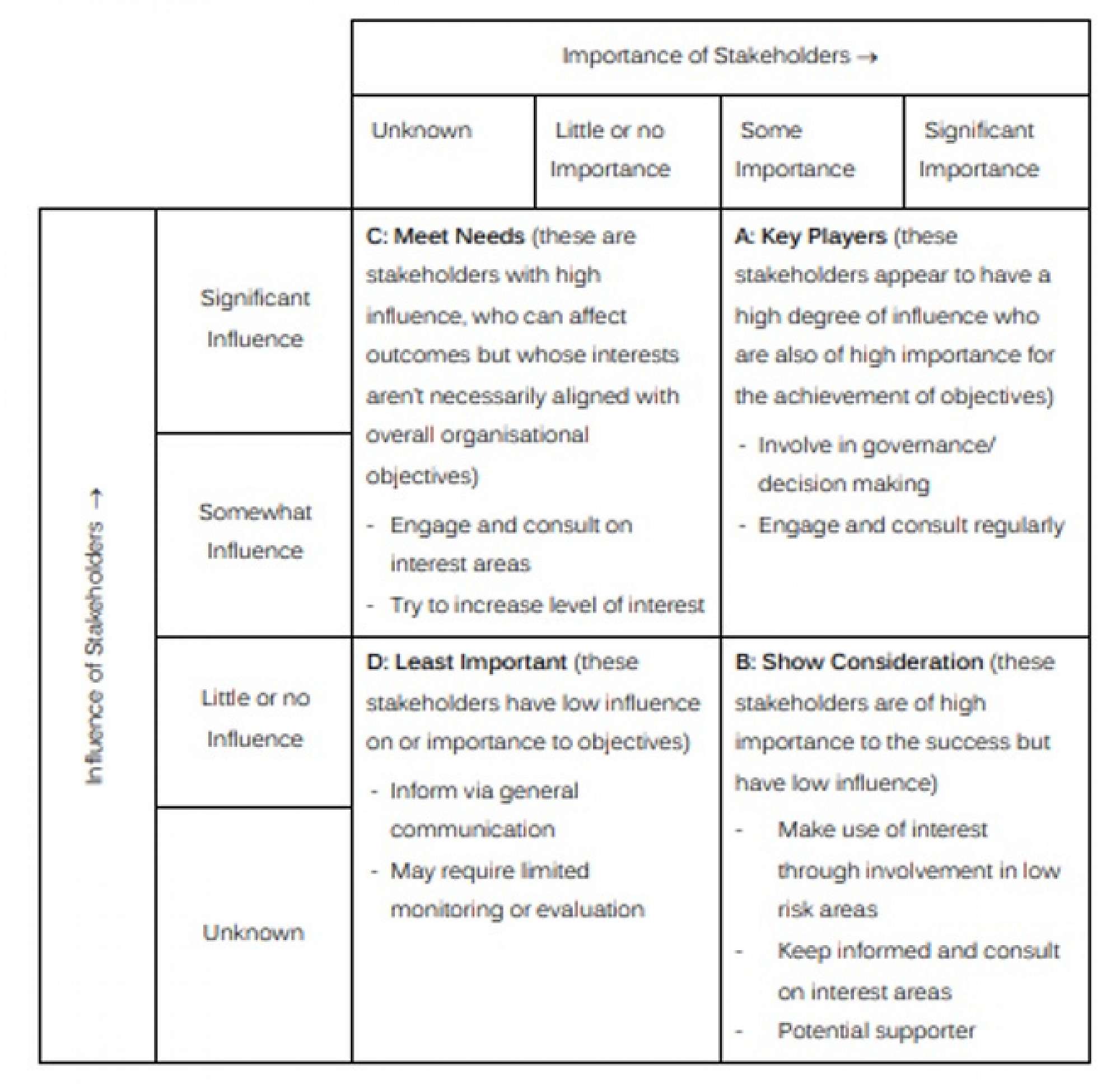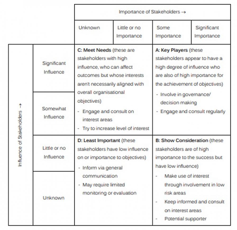 Let us first identify our stakeholders. Who are these stakeholders? Well, we have both internal and external stakeholders. It is important to identify them in order of importance. The Stakeholder Influence and Importance Analysis Matrix can be used for this. This will help us work out who we need to communicate with, what the communication is, the avenues of communication and how often we need to communicate with them.