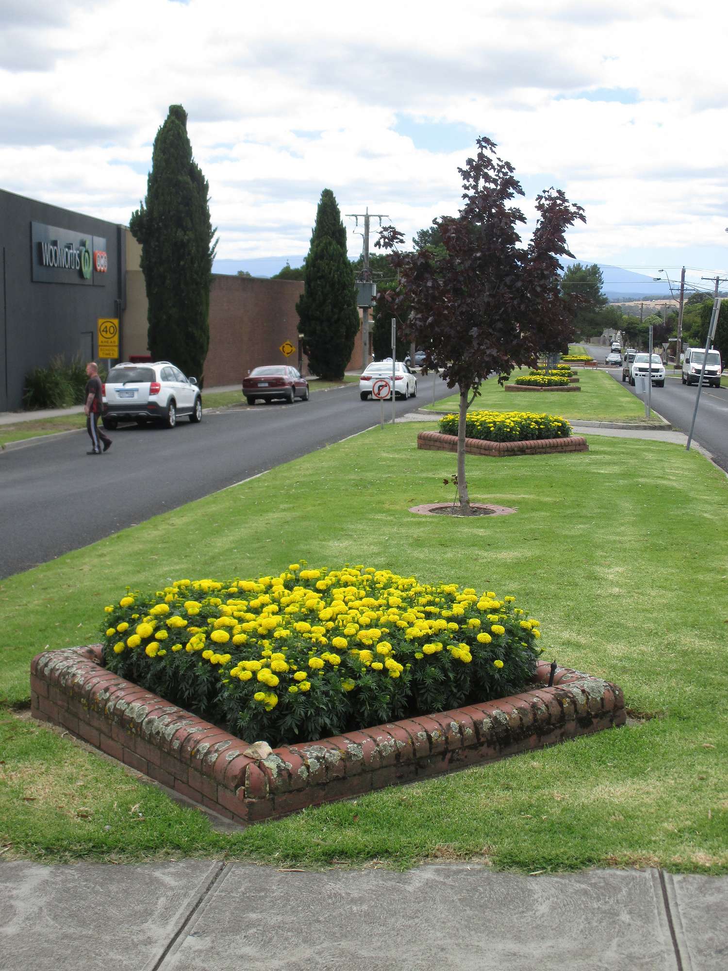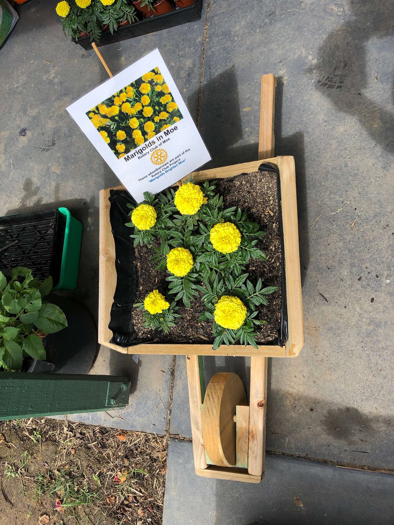 With the support of District Grants, Rotary Moe has been able "Brighten Up Moe" by planting roundabouts, garden beds and small wooden decorative wheelbarrows with a floral emblem - Marigolds.