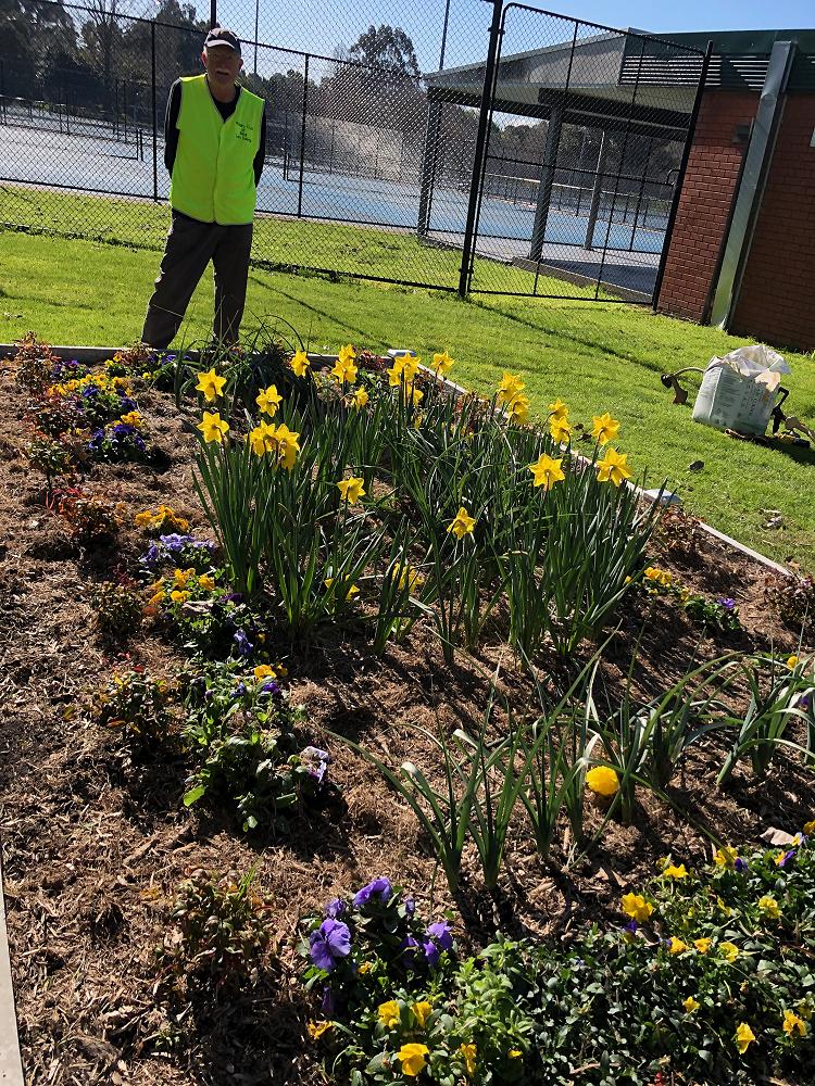 People in the Community responded very favourably to the flowers in the CBD. However, the Moe Rotary Botanic Gardens did not have flower beds, just many beautiful trees, and some walkers in the Gardens suggested we consider adding some flower beds. This led Rotary Moe to apply for a further District Grant in the 2019-20 year. This application led to the construction of a large flower bed near one of the main pathways. This took longer to construct due to the Covid-19 pandemic, however it was completed in early 2021. The flowers in this first season were 50 yellow Daffodils planted in a "Rotary circle" surrounded by 40 Blue/purple Dutch Irises and 50 yellow and blue Pansies. Rotarians weed and water when necessary. Comments from the many walkers and visitors have been very positive. We plan to have lots of Marigolds in Summer.
