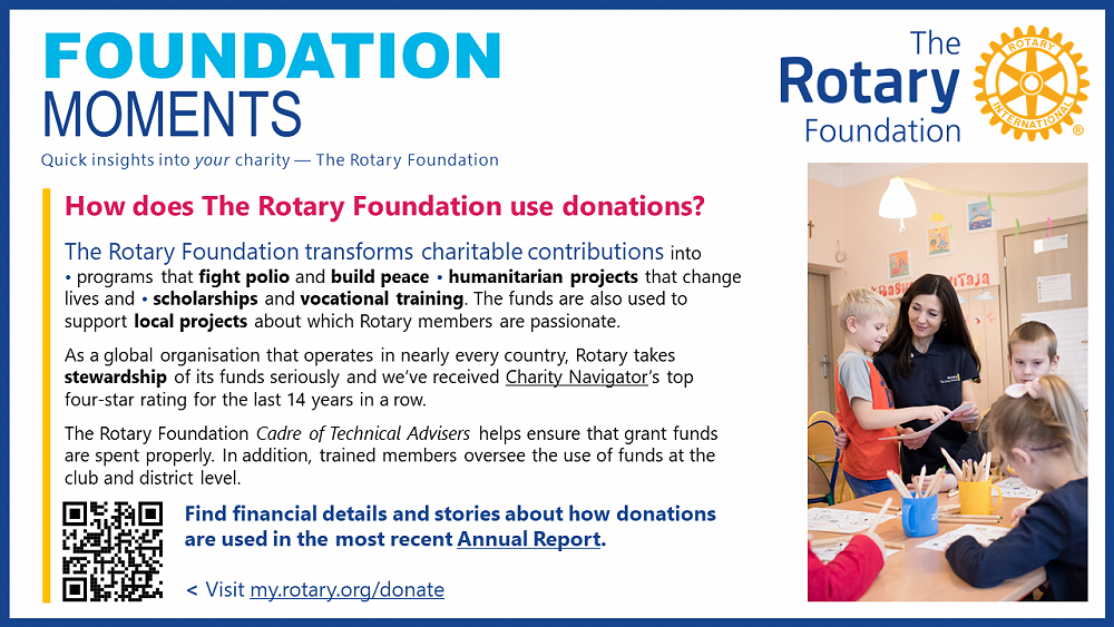 Each month, we’ll provide a snippet of information about the Foundation, “Foundation Moments”, in a form that can be readily used by clubs and districts in their newsletters, web pages, social media pages etc.