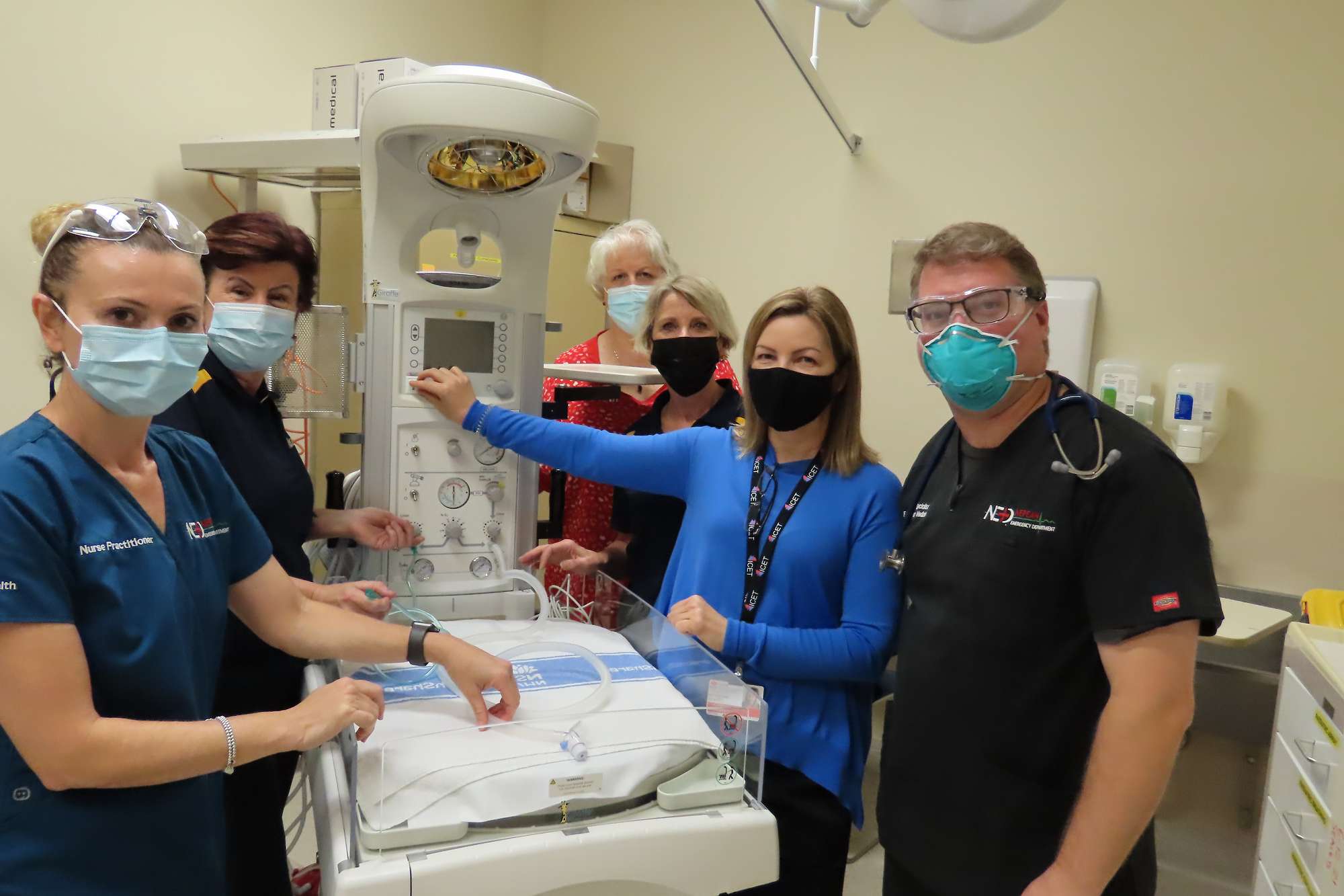 Photo above: Nurse Practitioner Linda Hasler, Rotarians Michele Ellery, Susan Wakefield, Carolyn Fitzpatrick Emergency Physician Dr Viktoria Seppi and Emergency Department Deputy Director Dr Mark Salter, are pictured examining the new Giraffe Warmer shortly after installation.