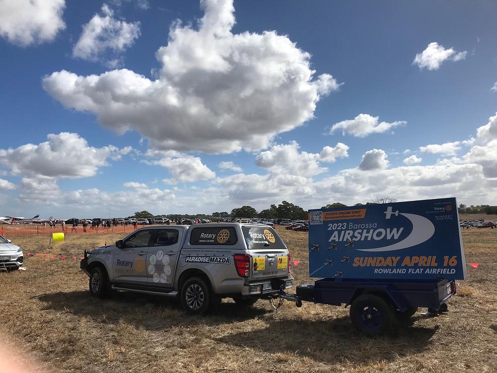 Rotary Fun Ute - Showcase Ute provided by Paradise Mazda, and Barossa Airshow promotional trailer donated by Bill Simons, D9510 Area Governor of Area 5 and member of the Rotary Club of Barossa Valley, and the 2023 Barossa Airshow signage donated by Jock Martin of Barossa Digital Print and Signs.