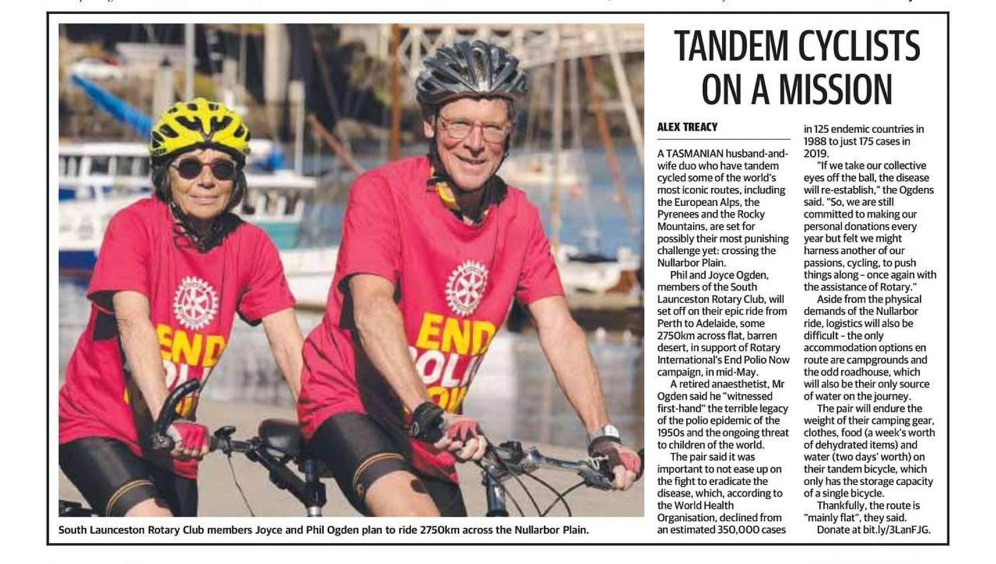 PDG Bob Aitken requested background details so he could put together a professional media release and all stakeholders submitted contributions and reviewed Bob’s compelling words. At the same time, District 9830 Photographer Rod Oliver was asked to take a photo shoot of the cyclists, Joyce and Phil Ogden, of the Rotary Club of South Launceston.