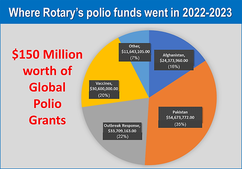 Each year, Rotary’s International Polio Committee, chaired by Past RI Director and Past Foundation Trustee, Michael McGovern, determines how the $150 million will be spent. Most of our funds are channelled through the World Health Organization and UNICEF, the implementing partners of the GPEI.