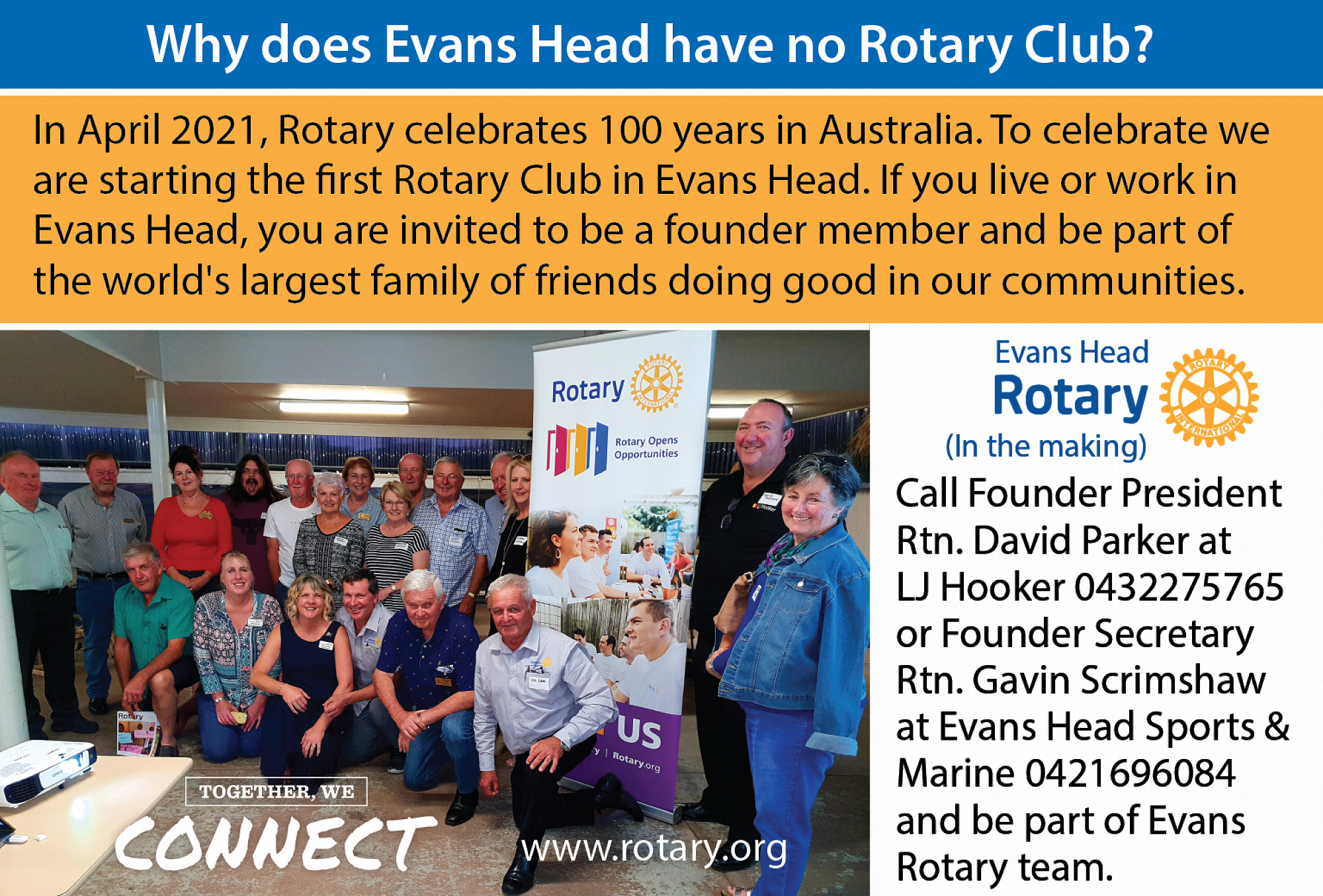 On 10th November we launched Evans Head Rotary with a wine & cheese cocktail sponsored by our District. The 14 community leaders who gathered at the Bowling Club decided to start a Rotary Club and elected David Parker as President to move forward. It’s important to close the sale when the enthusiasm is high, so the community takes accountability to invite members and start the Club. Neighbouring Rotary leaders too joined to support their initiative.