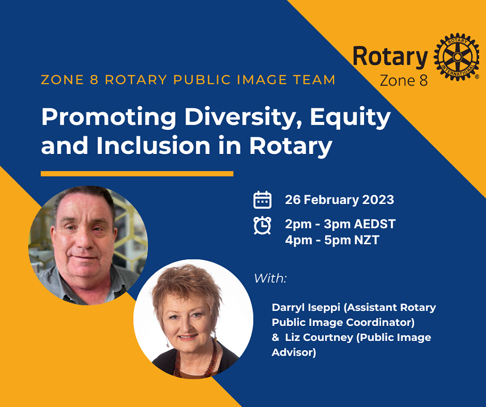 Join Assistant Rotary Public Image Coordinator Darryl Iseppi and Rotary Public Image Advisor Liz Courtney as they share ideas how you can promote diversity, equity and inclusion in your clubs and in turn your wider community.
