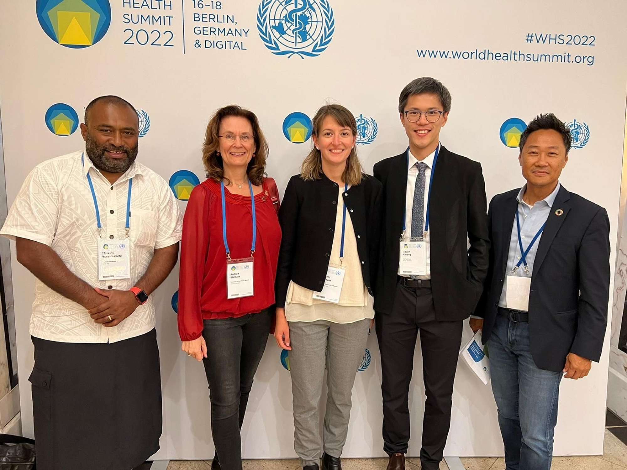 Photo taken at the WHO Summit in Berlin in September 2022. From left to right, Dr Ifereimi Waqainabete (Minister of Health of Fiji); Prof Dr Andrea Winkler (Technical University of Munich & University of Oslo); Annette Abraham (Federal Joint Committee, Germany); Edwin Kwong and Dr Kee Park (Harvard Medical School).