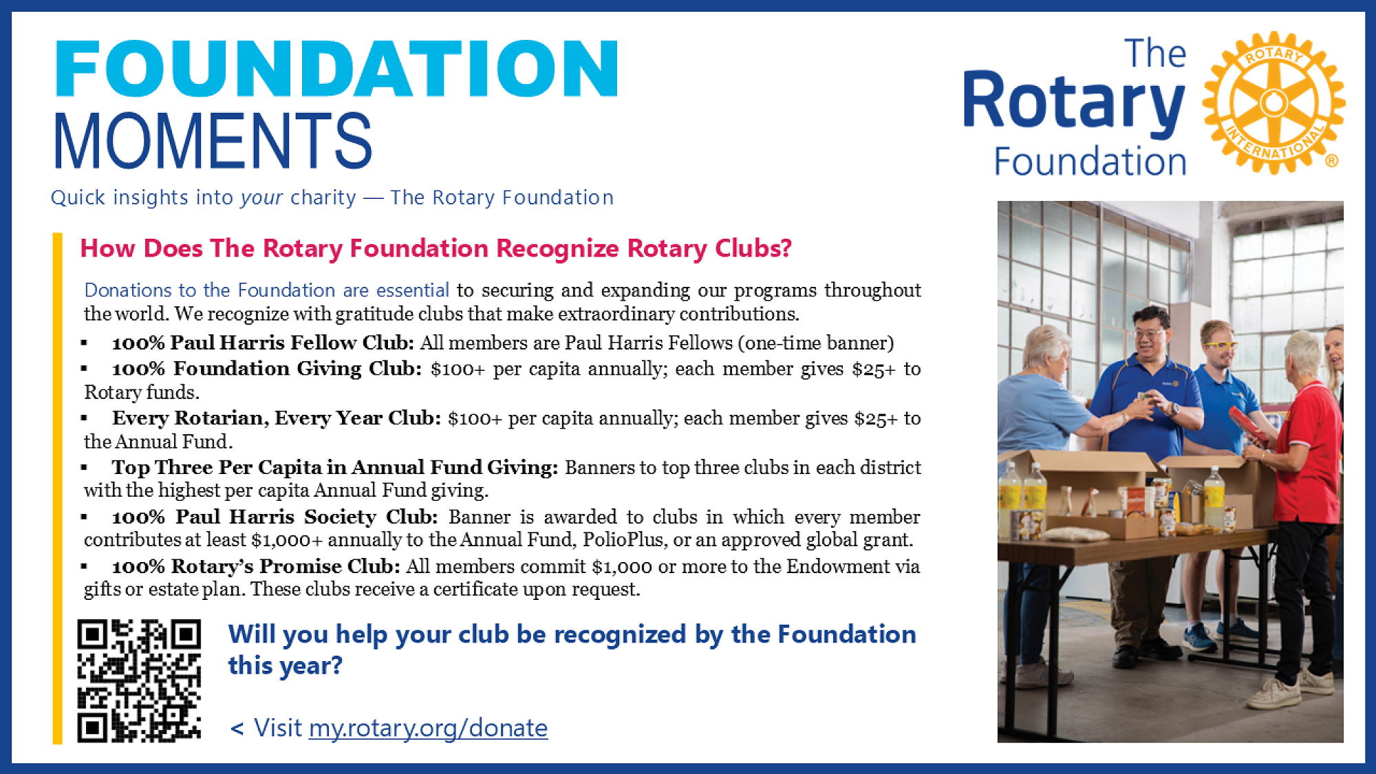 • 100% Foundation Giving Club: $100+ per capita annually; each member gives $25+ to Rotary funds.