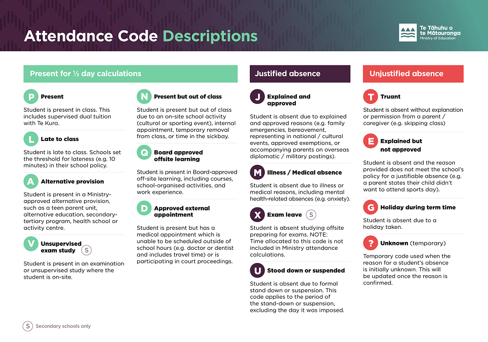 To give more clarity around absentee reason the below chart gives an explanation of what counts as present towards a students attendance and against a students attendance:
