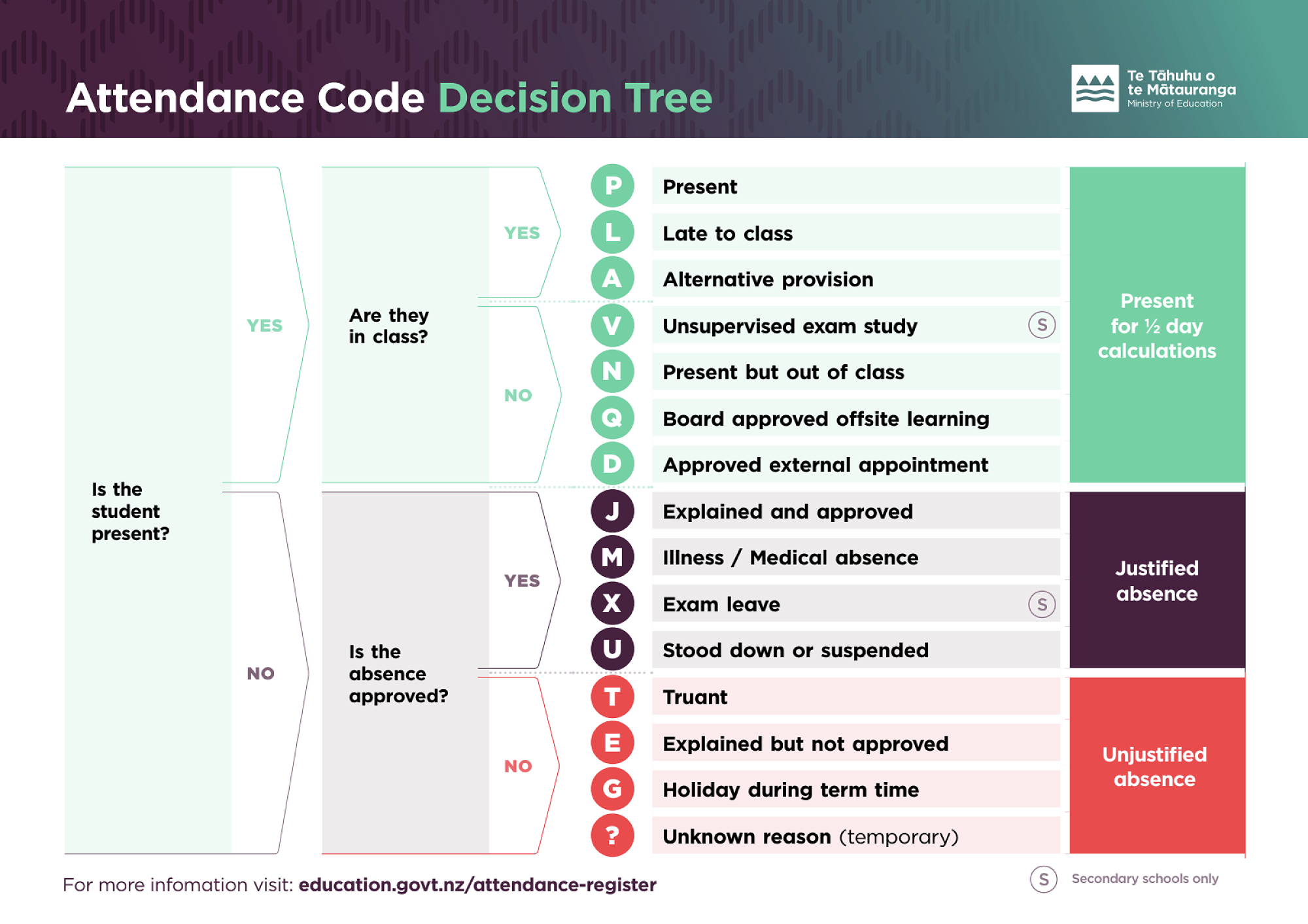 To date our school is sitting at 58% of students who are attending 90% plus of the time. Therefore as a Kura and with whānau support we want to improve the regular attendance of our young men. To give more clarity around absentee reason the below chart gives an explanation of what counts as present towards a students attendance and against a students attendance: