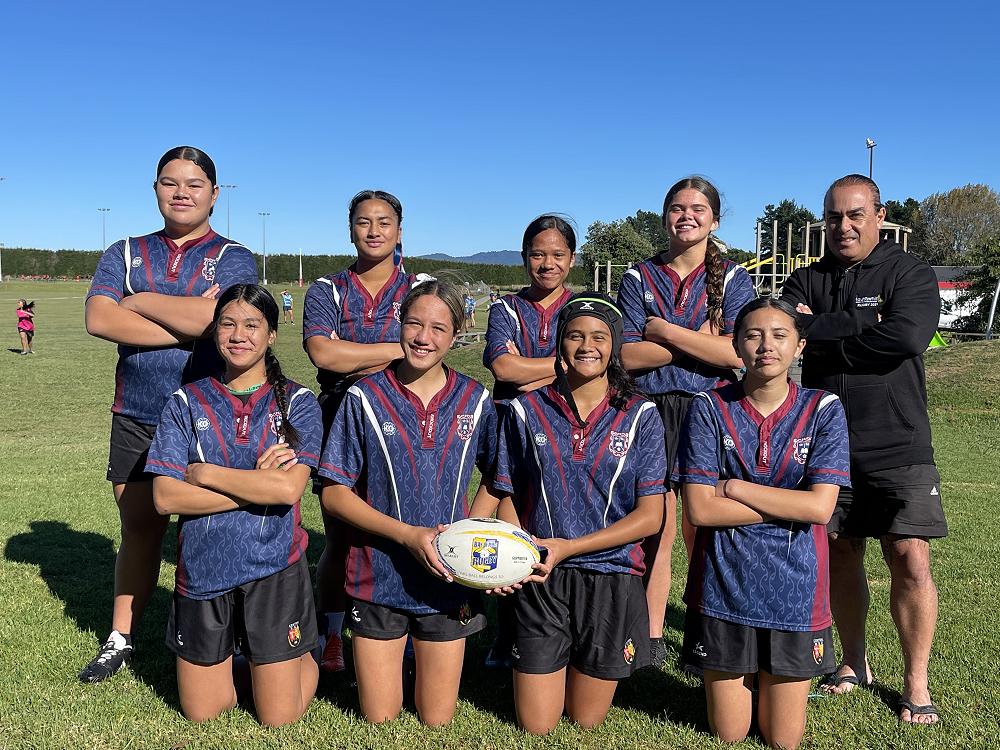 U 15 Navy. Back Row L - R: D’Arby Smalley-Huch, Te Aomihia Waiwai-Fleming, Maraea Makiha, McKenzie Anderson-Tito, Matua Richie Francis (Coach)