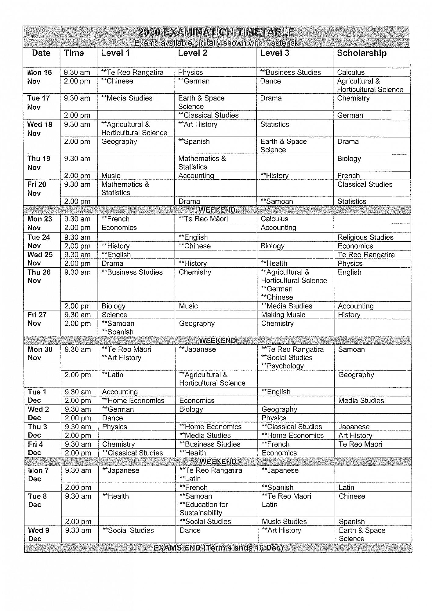 2020 NCEA EXTERNAL EXAMINATION TIMETABLE:
