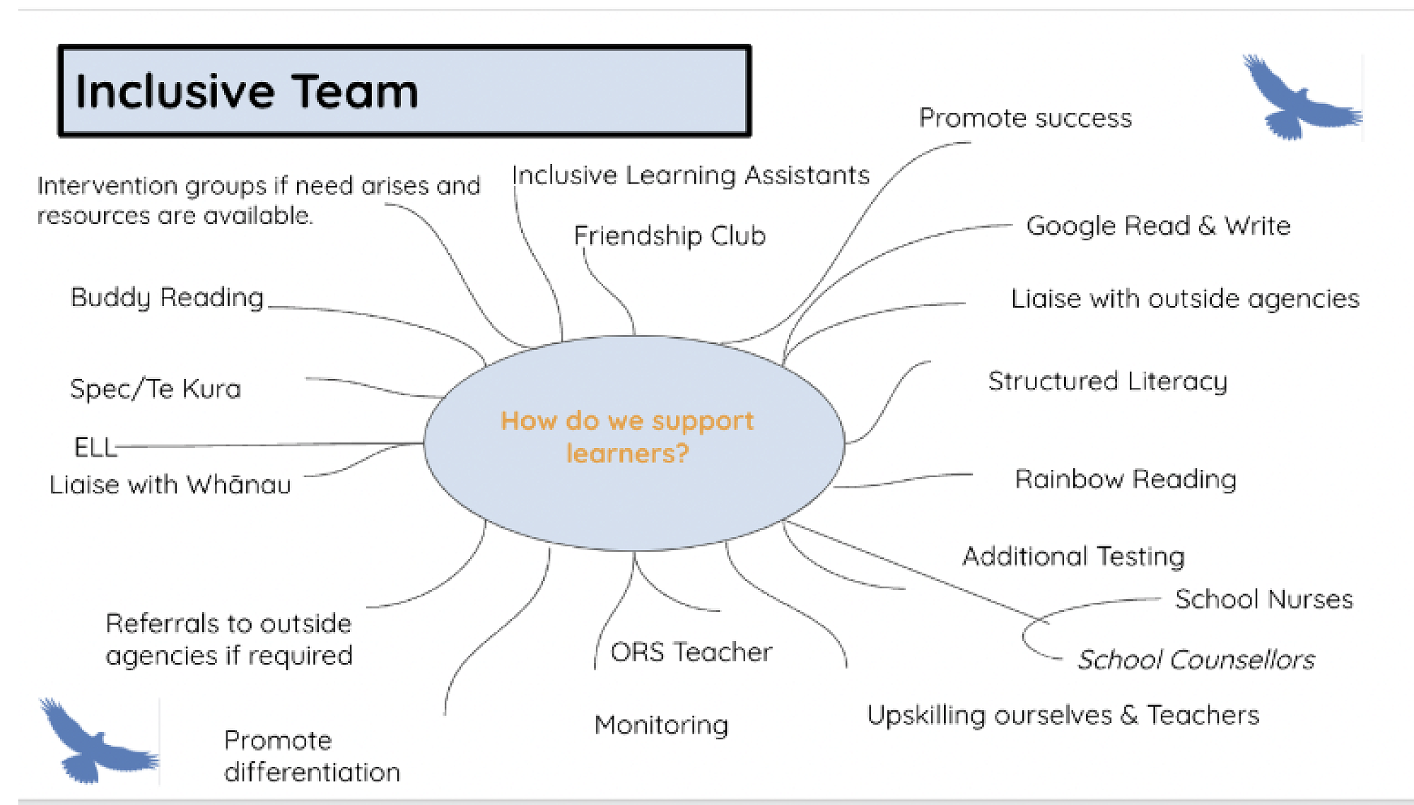 Our team, which includes three Learning Support Coordinators—Gail, Charlotte, and Raewyn—along with our ORS teacher, Dallas and 18 Inclusive Learning Assistants (ILAs), are supported by Brooke, our Inclusive Learning Leader.