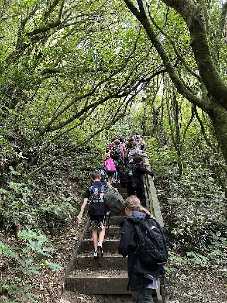 As we pushed forward we had got past the first bit and most likely the hardest set of stairs. As we moved forward we made it to the next part of the trip we had to go across a steep but thankfully wide path. It was quite the walk and when we FINALLY made it to the top we had to wait for everyone else because they were taking forever. Once they all came we ate some lunch and then we were split into 4 groups for Pākiki rotations. We learned some interesting facts about Aotearoa, rotating around the teachers so we all got some of everything e.g. The story of Ngake and Whātaitai with Paul, Kupe the great explorer with Mr Martin, native plants of Aotearoa with Miss Edge and European settlers with Mrs Temple.