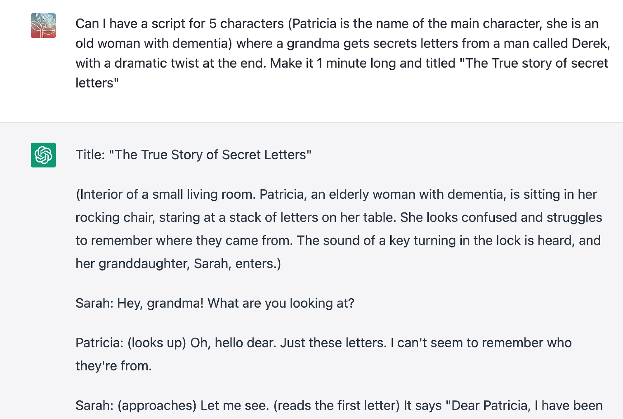 In class, students have been using it to generate a script for an idea they have had by providing a brief synopsis of the scene’s concept and then asking ChatGPT to generate dialogue for that scene. The generated dialogue can be used as a starting point for further development and refinement by a human writer.