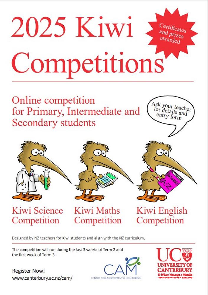 Year 7 and 8 students are invited to participate in 'Kiwi Competition' Science, Mathematics and English exams which are facilitated by the University of Canterbury. These examinations are based on the NZ Curriculum and replace the ICAS exams which are based on an Australian curriculum. These skills based Kiwi competitions are written by New Zealand teachers for New Zealand students and closely align with the New Zealand Curriculum.