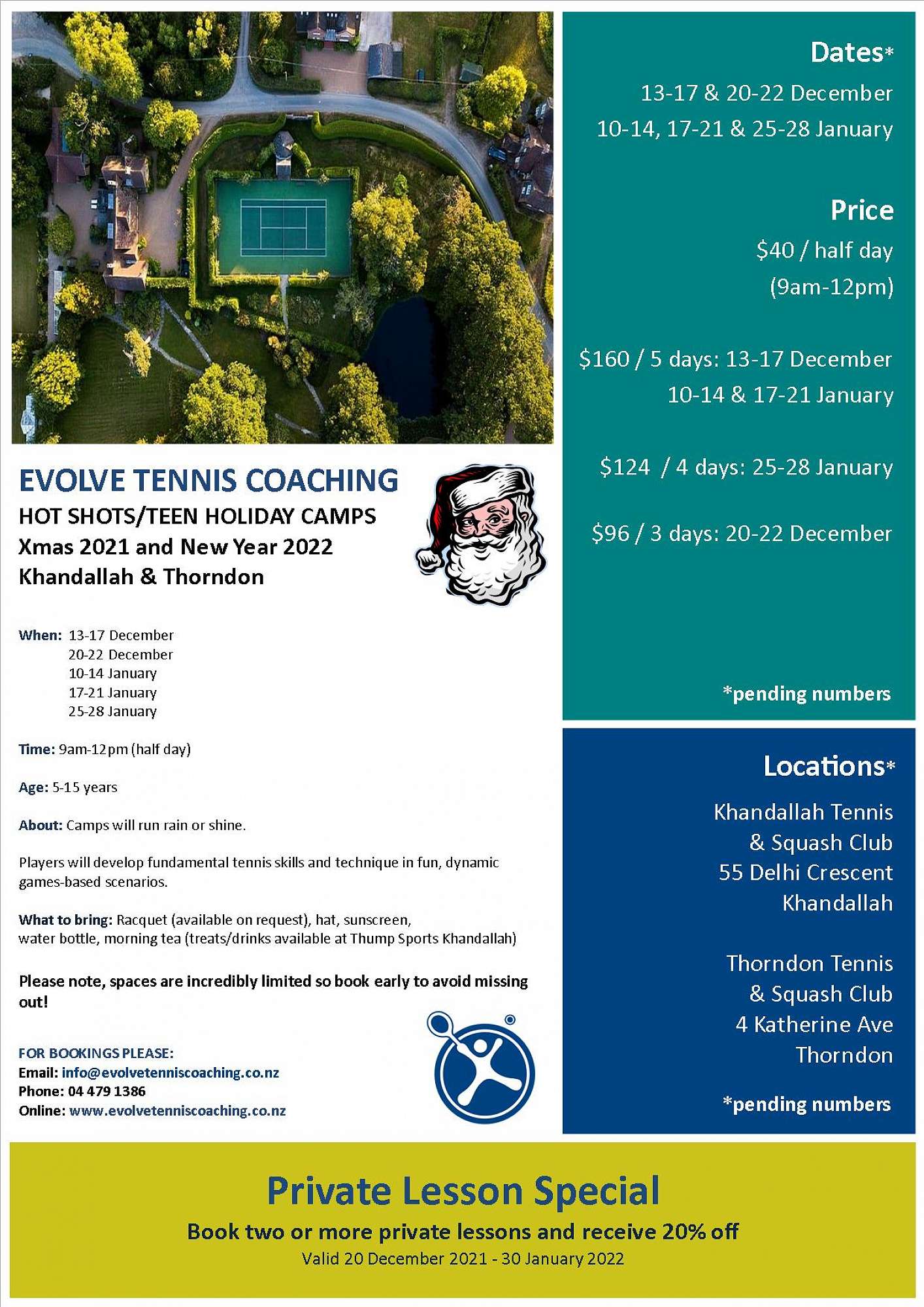 Evolve Tennis Coaching is running a tennis-specific holiday programme during the December and January school holidays at Khandallah Tennis & Squash Club and Thorndon Tennis and Squash Club. The camps will run from 9am-12pm on the dates specified. For further information or to book please contact Evolve Tennis Coaching on 479 1386 or info@evolvetenniscoaching.co.nz "