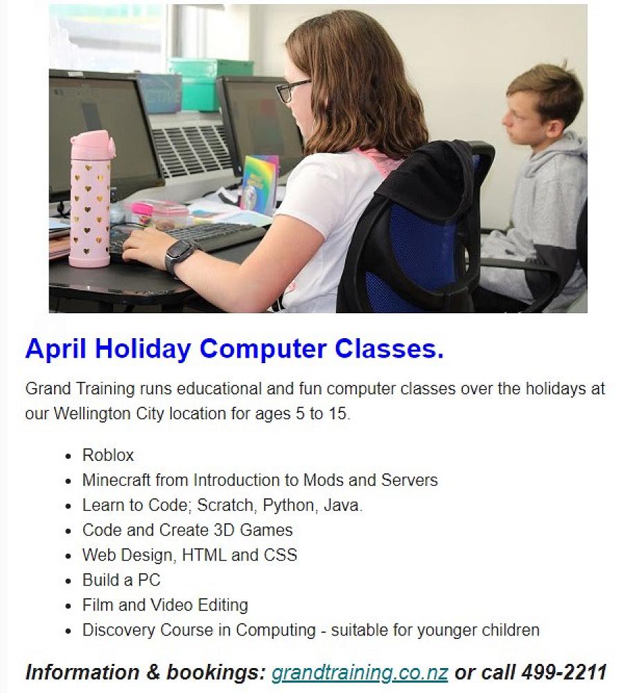 Grand Training runs educational and fun computer classes over the holidays Wellington City location for ages 5 to 15.