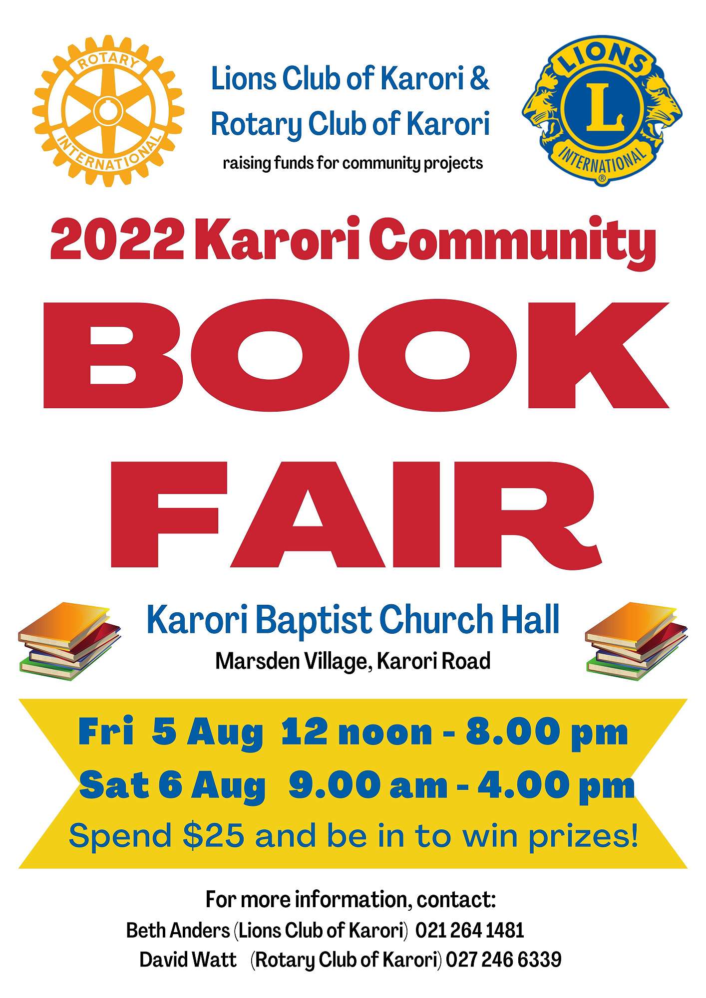 Karori Community Book Fair – Friday 5 August noon till 8.00 pm, and Saturday 6 August 9.00 am till 4.00 pm – at the Karori Baptist Church, 161 Karori Road – bargains and prizes on offer.