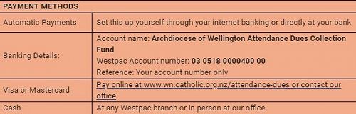 Cheque - Make out to Archdiocese of Wellington Attendance Dues Collection Fund. These can be