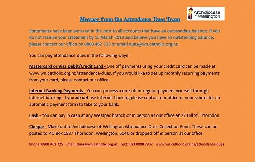 Statements have now been sent out in the post to all accounts. If you do not receive your statement by 15 March 2019 please contact our office on 0800 462 725 or email dues@wn.catholic.org.nz. Please see information attached for payment advice.