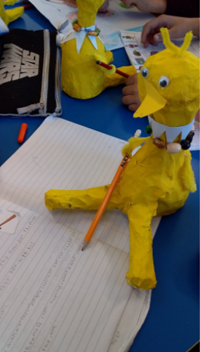 We created our sneetches by doing paper mache. This involved many layers of paper and glue (very messy) and letting it dry in between. We used a cup to create the base for it to sit and rolled up paper for the head, neck and legs. We then painted our creations and embellished with decorations to finish our Sneetch masterpieces!