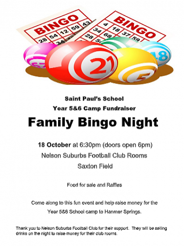 BINGO NIGHT - SAVE THE DATE: We are planning a family BINGO night for Friday 18th October. Please see the poster attached for details and invite your friends and family to come along. It will be a fun night out. Thanks to Nelson Suburbs Football Club for their support and use of their facilities.