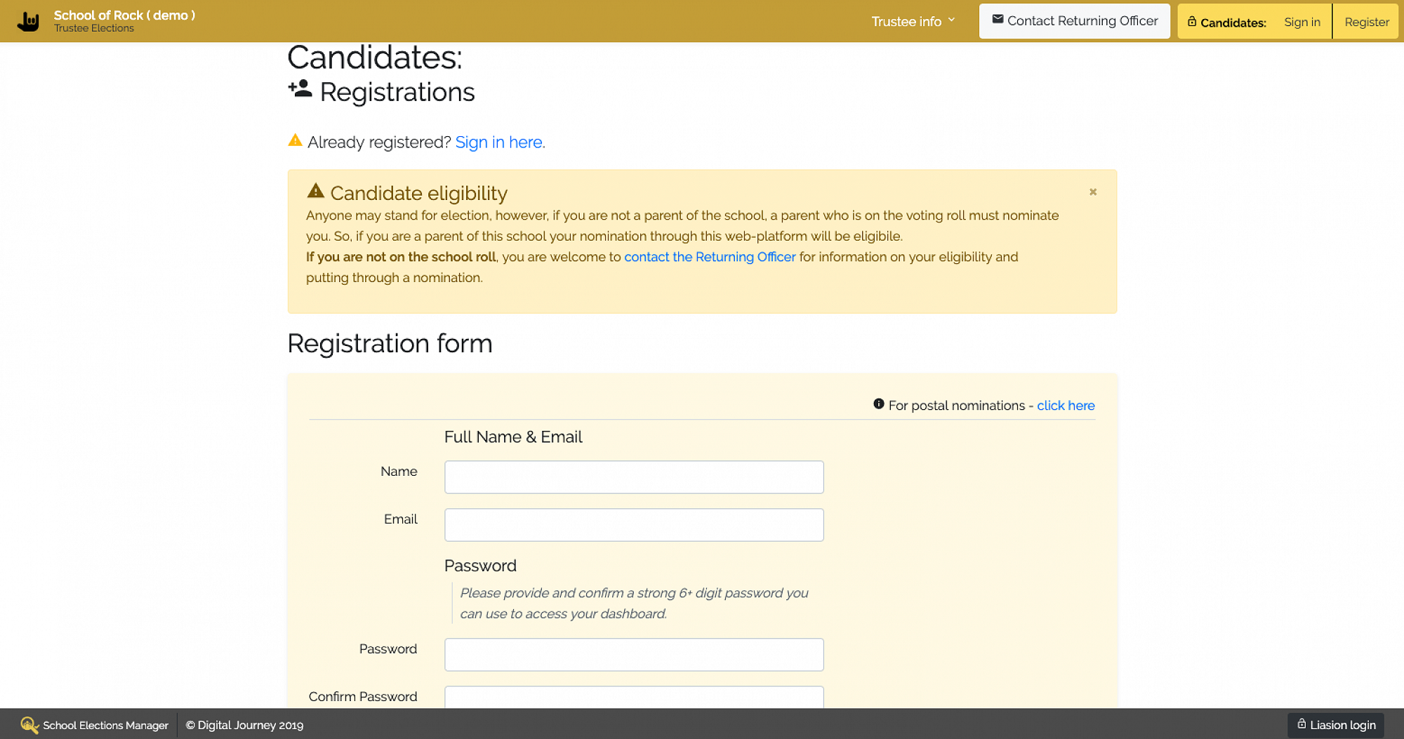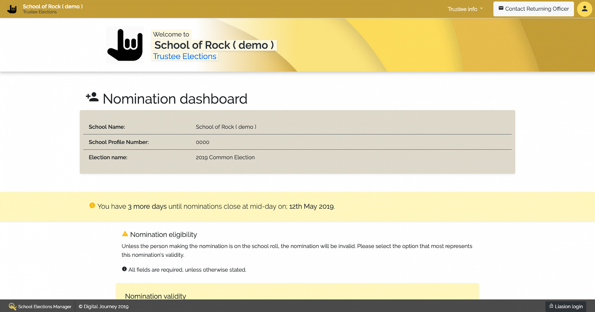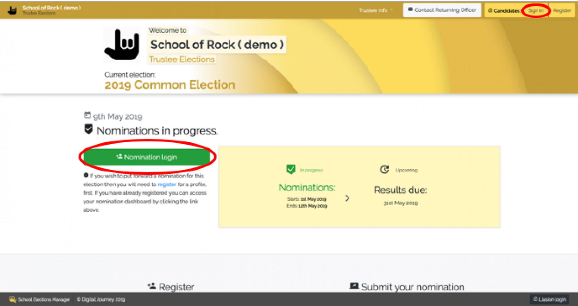 At any point, you can log back onto your dashboard and check the status of your Nomination by searching for your school on the School Elections homepage, and logging in using the green 'Nomination Login' button, or the yellow 'Sign in' button in the top right-hand side of the screen.