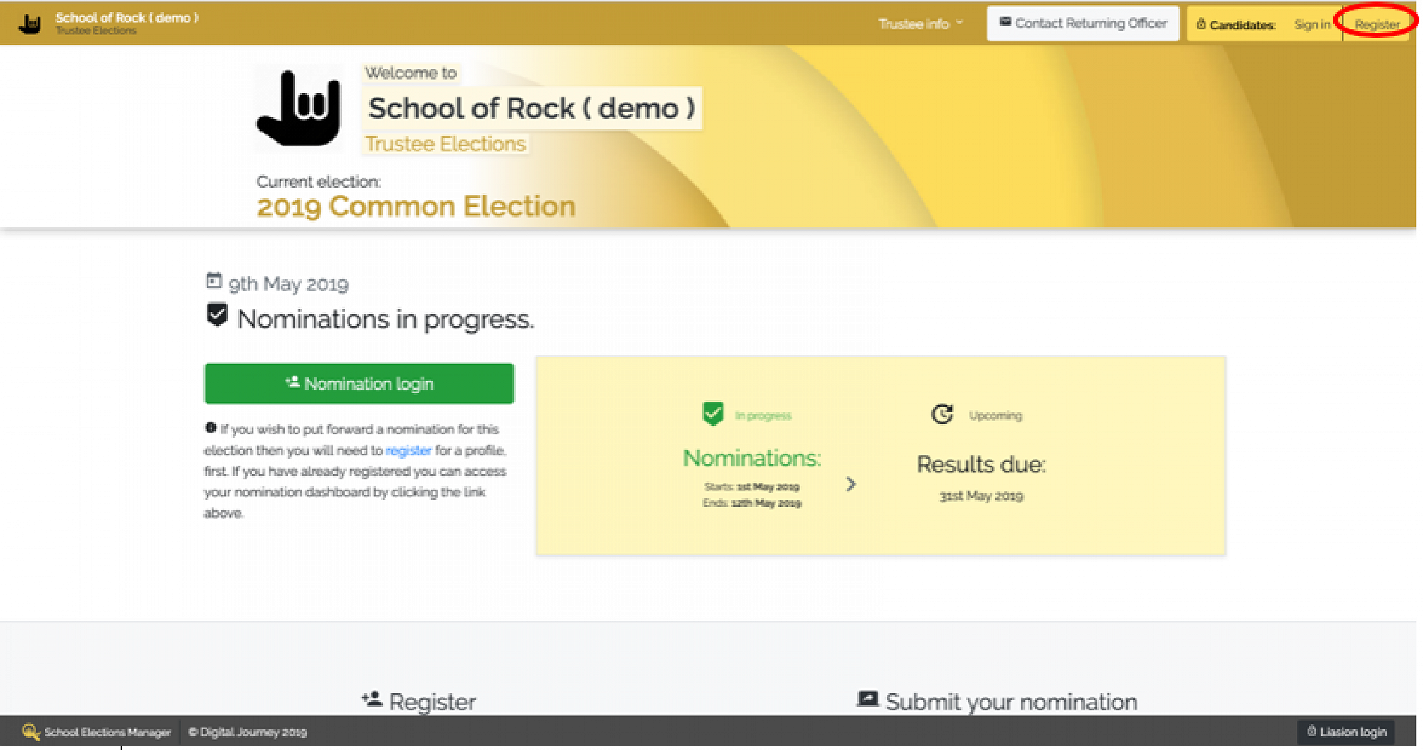 You will need to create a new profile in order to start your nomination. You can do this by clicking the 'Register' button on the top right-hand side of the page header.