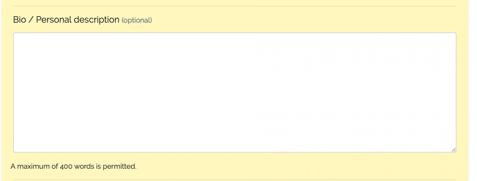 You can add a short bio about yourself, which can be no more than 400 words long. Please note that any extra spaces or symbols may be counted as an extra word, so even if you write on a word processor, the system may pick up your word count differently.